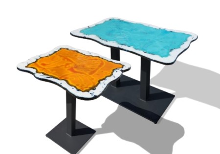 Bordene på FRIENDS-kollektionen er sammensat af metalbaser malet i forskellige farver og toppe i lavasten.