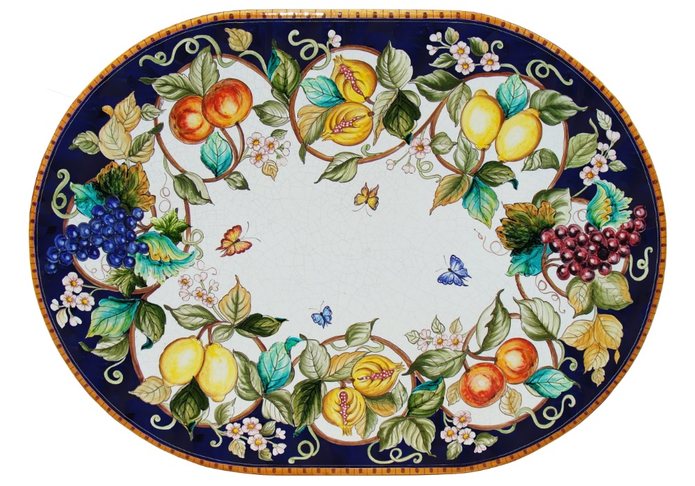 En af de rigeste dekorationer i denne kollektion, kendetegnet ved lyse nuancer af gult, grønt i alle dets nuancer og intens blå: dekorationsfarverne er inspireret af jordens dyrebare frugter, som altid har været en inspiration til kunstnerisk håndlavet keramik af Italien: fra Umbrien, til Toscana og Sicilien.