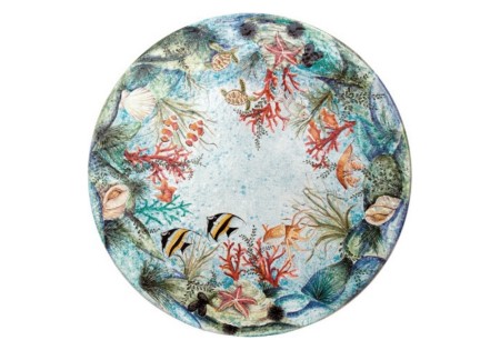 Dekoration inspireret af havet og dets nedsænkede skatte: farverige fisk, multiformede skaller og lyse røde koraller.