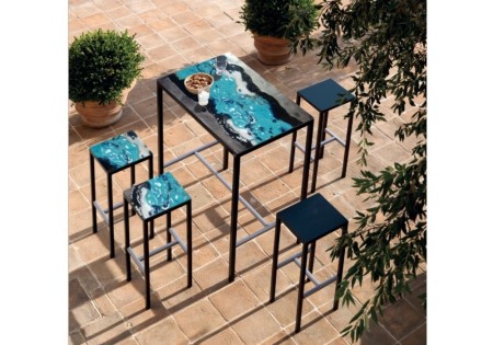 Bordene på FRIENDS-linjen er sammensat af metal stel malet i forskellige farver og toppe i vulkansk sten.